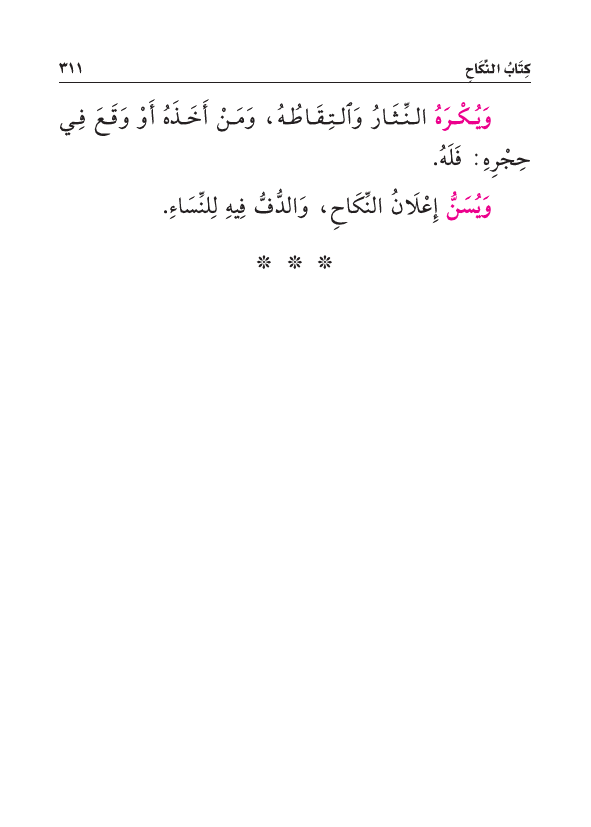 وَيُسَنُّ إِعْلَانُ النِّكَاحِ، وَالدُّفُّ فِيهِ لِلنِّسَاءِ.
