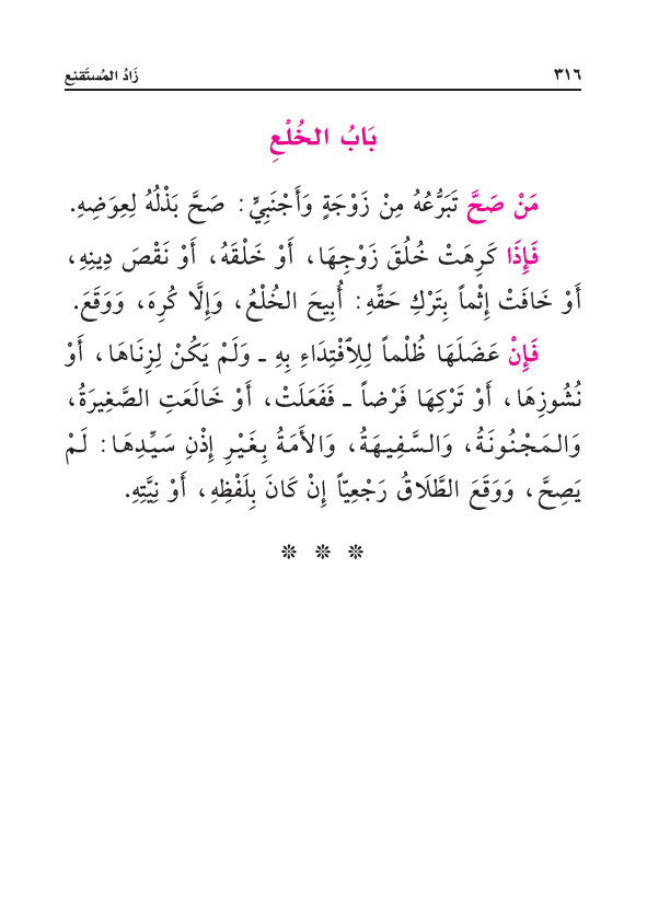 فَإِذَا كَرِهَتْ خُلُقَ زَوْجِهَا، أَوْ خَلْقَهُ، أَوْ نَقْصَ دِينِهِ، أَوْ خَافَتْ إِثْمًا بِتَرْكِ حَقِّهِ: أُبِيحَ الخُلْعُ، وَإِلَّا كُرِهَ، وَوَقَعَ.