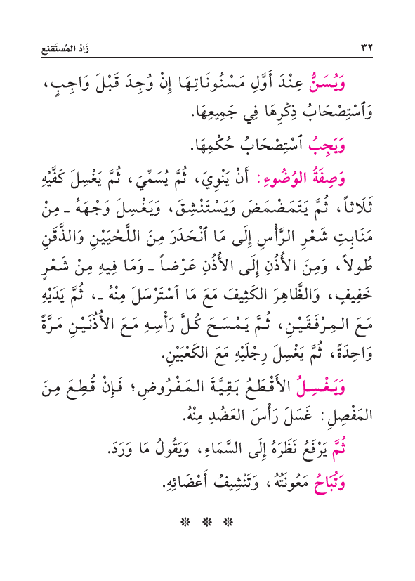 وَصِفَةُ الوُضُوءِ: أَنْ يَنْوِيَ، ثُمَّ يُسَمِّيَ، ثُمَّ يَغْسِلَ كَفَّيْهِ ثَلَاثاً، ثُمَّ يَتَمَضْمَضَ وَيَسْتَنْشِقَ، وَيَغْسِلَ وَجْهَهُ - مِنْ مَنَابِتِ شَعْرِ الرَّأْسِ إِلَى مَا انْحَدَرَ مِنَ اللَّحْيَيْنِ وَالذَّقْنِ طُولاً، وَمِنَ الأُذُنِ إِلَى الأُذُنِ عَرْضاً - وَمَا فِيهِ مِنْ شَعْرٍ خَفِيفٍ، وَالظَّاهِرَ الكَثِيفَ مَعَ مَا اسْتَرْسَلَ مِنْهُ -، ثُمَّ يَدَيْهِ مَعَ المِرْفَقَيْنِ، ثُمَّ يَمْسَحَ كُلَّ رَأْسِهِ مَعَ الأُذُنَيْنِ مَرَّةً وَاحِدَةً، ثُمَّ يَغْسِلَ رِجْلَيْهِ مَعَ الكَعْبَيْنِ.