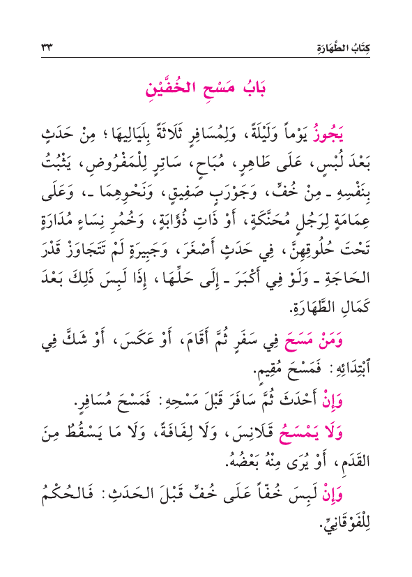 يَجُوزُ يَوْماً وَلَيْلَةً، وَلِمُسَافِرٍ ثَلَاثَةً بِلَيَالِيهَا؛ مِنْ حَدَثٍ بَعْدَ لُبْسٍ، عَلَى طَاهِرٍ، مُبَاحٍ، سَاتِرٍ لِلْمَفْرُوضِ، يَثْبُتُ بِنَفْسِهِ - مِنْ خُفٍّ، وَجَوْرَبٍ صَفِيقٍ، وَنَحْوِهِمَا -، وَعَلَىَ عِمَامَةٍ لِرَجُلٍ مُحَنَّكَةٍ، أَوْ ذَاتِ ذُؤَابَةٍ، وَخُمُرِ نِسَاءٍ مُدَارَةٍ تَحْتَ حُلُوقِهِنَّ، فِي حَدَثٍ أَصْغَرَ، وَجَبِيرَةٍ لَمْ تَتَجَاوَزْ قَدْرَ الحَاجَةِ - وَلَوْ فِي أَكْبَرَ - إِلَى حَلِّهَا، إِذَا لَبِسَ ذَلِكَ بَعْدَ كَمَالِ الطَّهَارَةِ.
