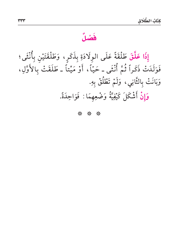 إِذَا عَلَّقَ طَلْقَةً عَلَى الوِلَادَةِ بِذَكَرٍ، وَطَلْقَتَيْنِ بِأُنْثَى؛ فَوَلَدَتْ ذَكَرًا ثُمَّ أُنْثَى -حَيّاً، أَوْ مَيِّتاً - طَلَقَتْ بِالأَوَّلِ، وَبَانَتْ بِالثَّانِي، وَلَمْ تَطْلُقْ بِهِ.
