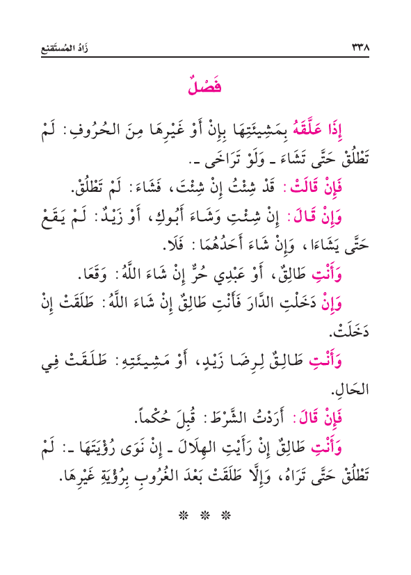 إِذَا عَلَّقَهُ بِمَشِيئَتِهَا بِإِنْ أَوْ غَيْرِهَا مِنَ الحُرُوفِ: لَمْ تَطْلُقْ حَتَّى تَشَاءَ - وَلَوْ تَرَاخَى -.