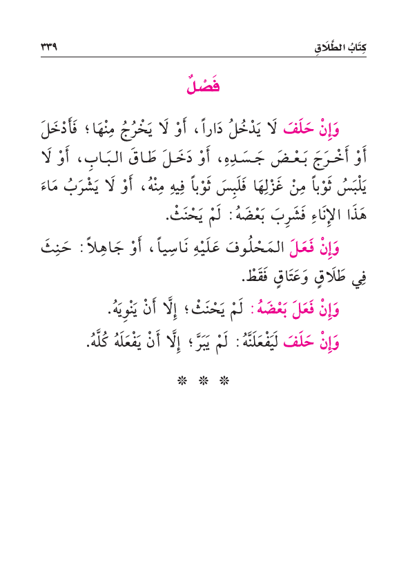 وَإِنْ حَلَفَ لَا يَدْخُلُ دَاراً، أَوْ لَا يَخْرُجُ مِنْهَا؛ فَأَدْخَلَ أَوْ أَخْرَجَ بَعْضَ جَسَدِهِ، أَوْ دَخَلَ طَاقَ البَابِ، أَوْ لَا يَلْبَسُ ثَوْباً مِنْ غَزْلِهَا فَلَبِسَ ثَوْباً فِيهِ مِنْهُ، أَوْ لَا يَشْرَبُ مَاءَ هَذَا الإِنَاءِ فَشَرِبَ بَعْضَهُ: لَمْ يَحْنَثْ.