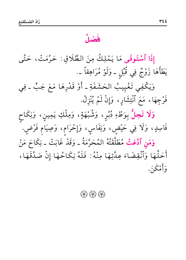 إِذَا اسْتَوفَى مَا يَمْلِكُ مِنَ الطَّلَاقِ: حَرُمَتْ، حَتَّى يَطَأَهَا زَوْجٌ فِي قُبُلٍ - وَلَوْ مُرَاهِقاً -.