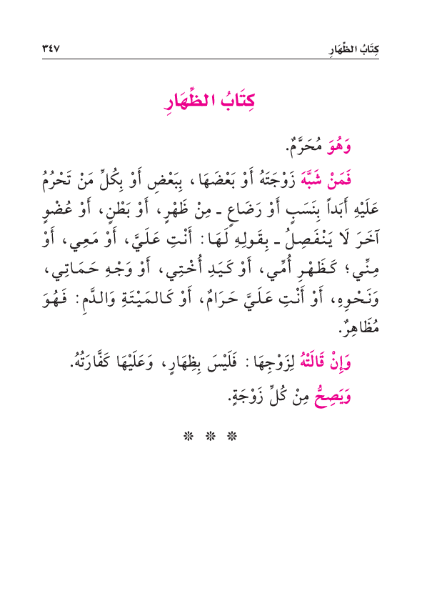 فَمَنْ شَبَّهَ زَوْجَتَهُ، أَوْ بَعْضَهَا بِبَعْضِ، أَوْ بِكُلِّ مَنْ تَحْرُمُ عَلَيْهِ أَبَدًا بِنَسَبٍ أَوْ رَضَاعٍ - مِنْ ظَهْرٍ، أَوْ بَطْنٍ، أَوْ عُضْوٍ آخَرَ لَا يَنْفَصِلُ - بِقَولِهِ لَهَا: أَنْتِ عَلَيَّ، أَوْ مَعِي، أَوْ مِنِّي؛ كَظَهْرِ أُمِّي، أَوْ كَيَدِ أُخْتِي، أَوْ وَجْهِ حَمَاتِي، وَنَحْوِهِ، أَوْ أَنْتِ عَلَيَّ حَرَامٌ، أَوْ كَالمَيْتَةِ وَالدَّمِ: فَهُوَ مُظَاهِرٌ.
