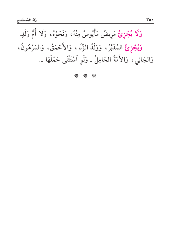وَلَا يُجْزِئُ مَرِيضٌ مَأْيُوسٌ مِنْهُ وَنَحْوُهُ، وَلَا أُمُّ وَلَدٍ.