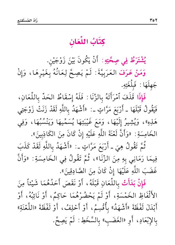 فَإِذَا قَذَفَ امْرَأَتَهُ بِالزِّنَا: فَلَهُ إِسْقَاطُ الحَدِّ بِاللِّعَانِ، فَيَقُولُ قَبْلَهَا - أَرْبَعَ مَرَّاتٍ: «أَشْهَدُ بِاللَّهِ لَقَدْ زَنَتْ زَوْجَتِي هَذِهِ، وَيُشِيرُ إِلَيْهَا، وَمَعَ غَيْبَتِهَا يُسَمِّيهَا وَيَنْسِبُهَا»، وَفِي الخَامِسَةِ: «وَأَنَّ لَعْنَةَ اللَّهِ عَلَيْهِ إِنْ كَانَ مِنَ الكَاذِبِينَ».