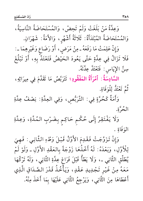 السَّادِسَةُ: امْرَأَةُ المَفْقُودِ: تَتَرَبَّصُ مَا تَقَدَّمَ فِي مِيرَاثِهِ، ثُمَّ تَعْتَدُّ لِلْوَفَاةِ.