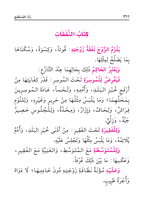 وَلِلْفَقِيرَةِ تَحْتَ الفَقِيرِ: مِنْ أَدْنَى خُبْزِ البَلَدِ، وَأُدُمٌ يُلَائِمُهُ، وَمَا يَلْبَسُ مِثْلُهَا وَتَجْلِسُ عَلَيْهِ.