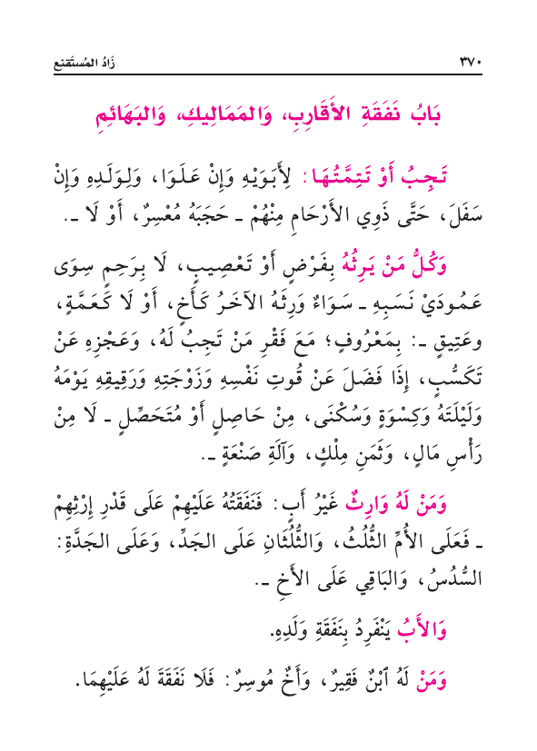 وَكُلُّ مَنْ يَرِثُهُ بِفَرْضٍ أَوْ تَعْصِيبٍ، لَا بِرَحِمٍ سِوَى عَمُودَيْ نَسَبِهِ - سَوَاءٌ وَرِثَهُ الآخَرُ كَأَخٍ، أَوْ لَا كَعَمَّةٍ، وعَتِيقٍ - بِمَعْرُوفٍ، مَعَ فَقْرِ مَنْ تَجِبُ لَهُ، وَعَجْزِهِ عَنْ تَكَسُّبٍ، إِذَا فَضَلَ عَنْ قُوتِ نَفْسِهِ وَزَوْجَتِهِ وَرَقِيقِهِ يَوْمَهُ وَلَيْلَتَهُ وَكِسْوَةٍ وَسُكْنَى، مِنْ حَاصِلٍ أَوْ مُتَحَصِّلٍ، لَا مِنْ رَأْسِ مَالٍ، وَثَمَنِ مُلْكٍ وَآلَةِ صَنْعَةٍ.