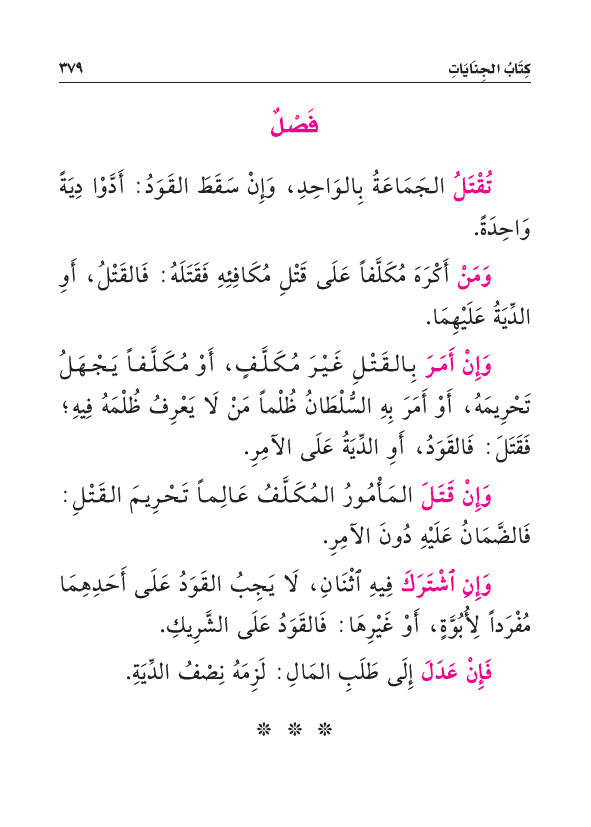 وَإِنْ قَتَلَ المَأْمُورُ المُكَلَّفُ عَالِماً تَحْرِيمَ القَتْلِ: فَالضَّمَانُ عَلَيْهِ دُونَ الآمِرِ.