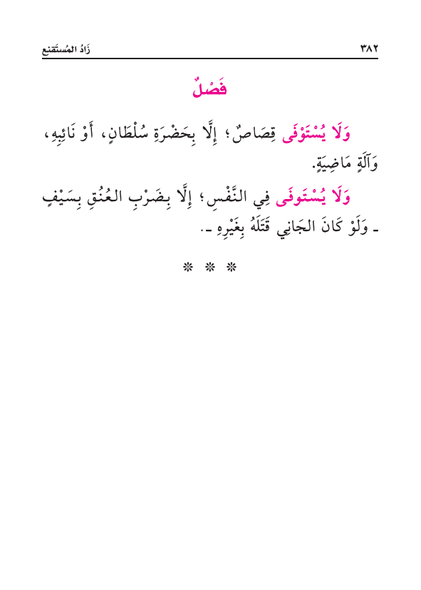 وَلَا يُسْتَوْفَى قِصَاصٌ؛ إِلَّا بِحَضْرَةِ سُلْطَانٍ، أَوْ نَائِبِهِ، وَآلَةٍ مَاضِيَةٍ.