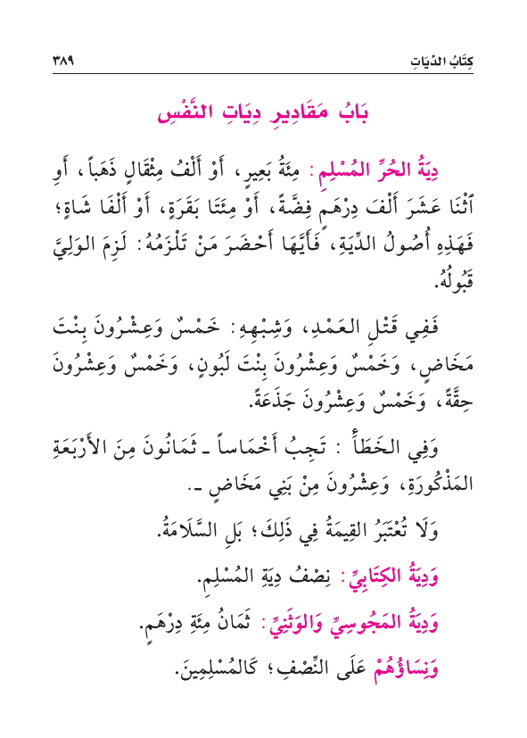 دِيَةُ الحُرِّ المُسْلِمِ: مِئَةُ بَعِيرٍ، أَوْ أَلْفُ مِثْقَالٍ ذَهَبًا، أَوِ اثْنَا عَشَرَ أَلْفَ دِرْهَمٍ فِضَّةً، أَوْ مِئَتَا بَقَرَةٍ، أَوْ أَلْفَا شَاةٍ.
