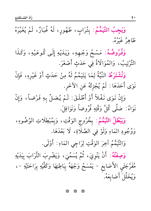 وَصِفَتُهُ: أَنْ يَنْوِيَ، ثُمَّ يُسَمِّيَ، وَيَضْرِبَ التُّرَابَ بِيَدَيْهِ مُفَرَّجَتَيِ الأَصَابِعِ، يَمْسَحُ وَجْهَهُ بِبَاطِنِهَا وَكَفَّيْهِ بِرَاحَتَيْهِ، وَيُخَلِّلُ أَصَابِعَهُ.