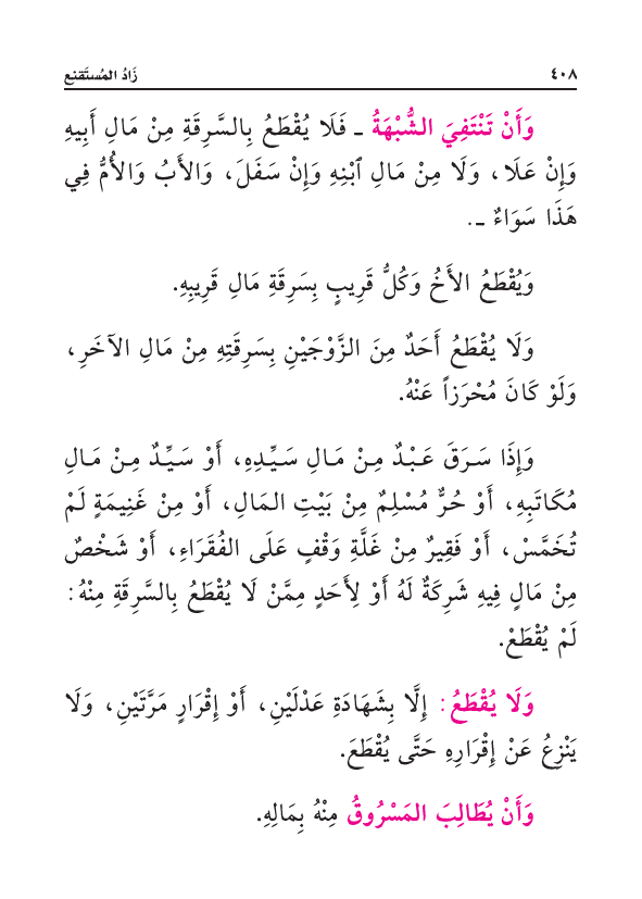 وَأَنْ تَنْتَفِيَ الشُّبْهَةُ - فَلَا يُقْطَعُ بِالسَّرِقَةِ مِنْ مَالِ أَبِيهِ وَإِنْ عَلَا، وَلَا مِنْ مَالِ ابْنِهِ وَإِنْ سَفُلَ، وَالأَبُ وَالأُمُّ فِي هَذَا سَوَاءٌ -.