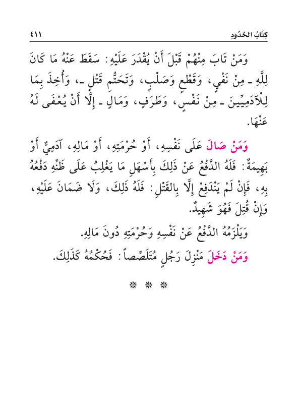 وَمَنْ صَالَ عَلَى نَفْسِهِ، أَوْ حُرْمَتِهِ، أَوْ مَالِهِ، آدَمِيٌّ أَوْ بَهِيمَةٌ: فَلَهُ الدَّفْعُ عَنْ ذَلِكَ بِأَسْهَلِ مَا يَغْلِبُ عَلَى ظَنِّهِ دَفْعُهُ بِهِ، فَإِنْ لَمْ يَنْدَفِعْ إِلَّا بِالقَتْلِ: فَلَهُ ذَلِكَ، وَلَا ضَمَانَ عَلَيْهِ، وَإِنْ قُتِلَ فَهُوَ شَهِيدٌ.