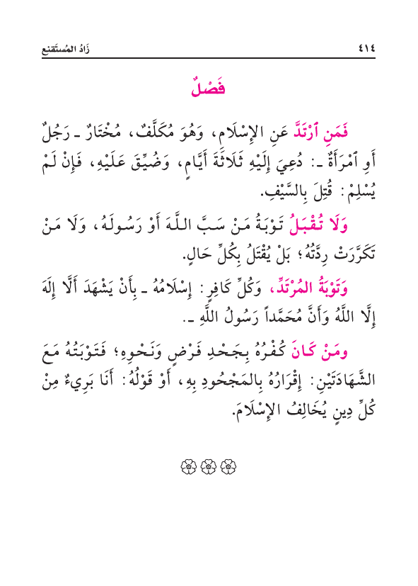فَمَنِ ارْتَدَّ عَنِ الإِسْلَامِ، وَهُوَ مُكَلَّفٌ مُخْتَارٌ - رَجُلٌ أَوِ امْرَأَةٌ -: دُعِيَ إِلَيْهِ ثَلَاثَةَ أَيَّامٍ، وَضُيِّقَ عَلَيْهِ، فَإِنْ لَمْ يُسْلِمْ: قُتِلَ بالسَّيْفِ.
