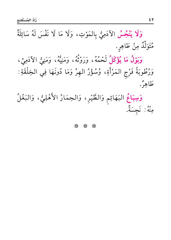 وَلَا يَنْجُسُ الآدَمِيُّ بِالمَوْتِ، وَلَا مَا لَا نَفْسَ لَهُ سَائِلَةٌ مُتَوَلِّدٌ مِنْ طَاهِرٍ.