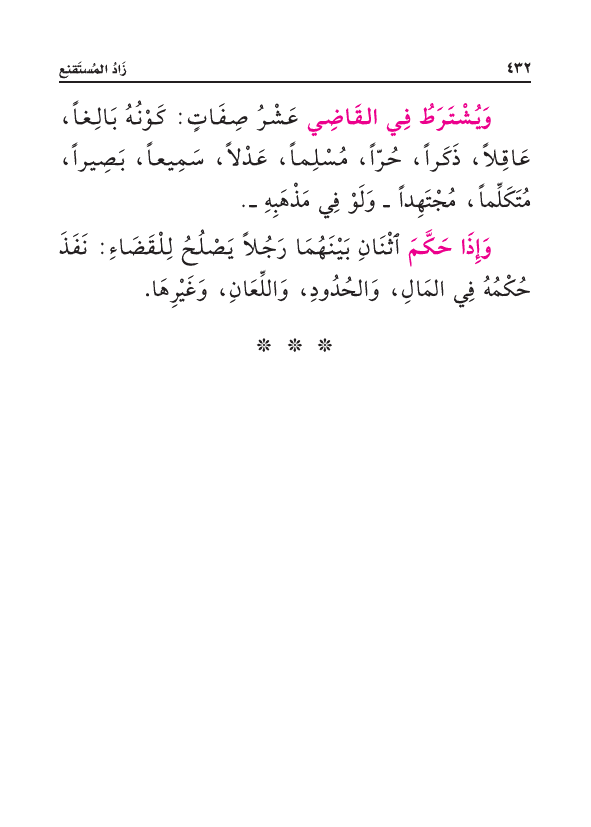 وَيُشْتَرَطُ فِي القَاضِي عَشْرُ صِفَاتٍ: كَوْنُهُ بَالِغاً، عَاقِلاً، ذَكَراً، حُرّاً، مُسْلِماً عَدْلاً، سَمِيعاً، بَصِيراً، مُتَكَلِّماً، مُجْتَهِداً وَلَوْ فِي مَذْهَبِهِ.