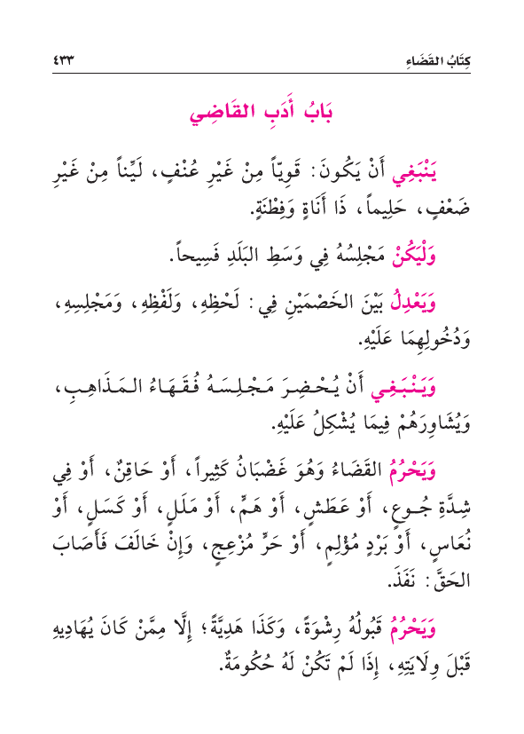 وَيَحْرُمُ القَضَاءُ وَهُوَ غَضْبَانٌ كَثِيراً، أَوْ حَاقِنٌ، أَوْ فِي شِدَّةِ جُوعٍ، أَوْ عَطَشٍ، أَوْ هَمٍّ، أَوْ مَلَلٍ، أَوْ كَسَلٍ، أَوْ نُعَاسٍ، أَوْ بَرْدٍ مُؤْلِمٍ، أَوْ حَرٍّ مُزْعِجٍ، وَإِنْ خَالَفَ فَأَصَابَ الحَقَّ: نَفَذَ.