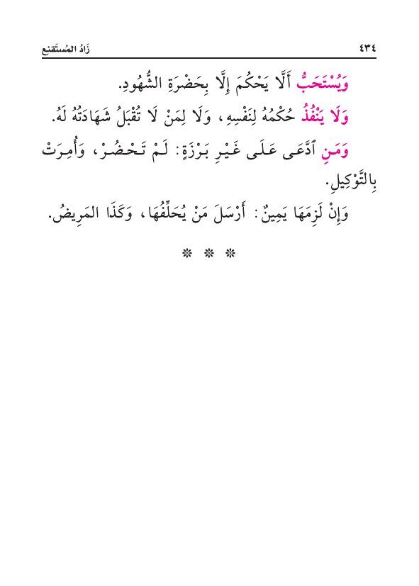وَيُسْتَحَبُّ أَلَّا يَحْكُمَ؛ إِلَاّ بِحَضْرَةِ الشُّهُودِ.