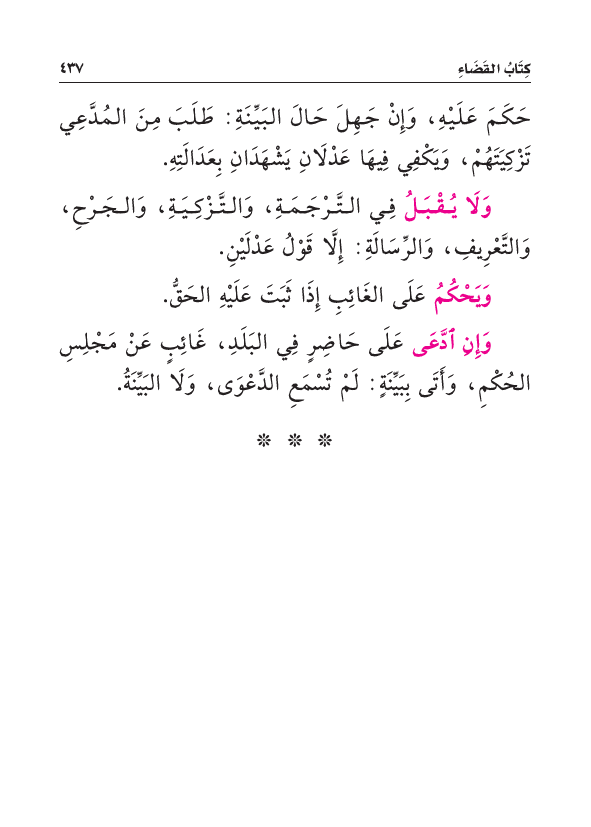وَلَا يُقْبَلُ فِي التَّرْجَمَةِ وَالتَّزْكِيَةِ وَالجَرْحِ وَالتَّعْرِيفِ وَالرِّسَالَةِ؛ إِلَّا قَوْلُ عَدْلَيْنِ.