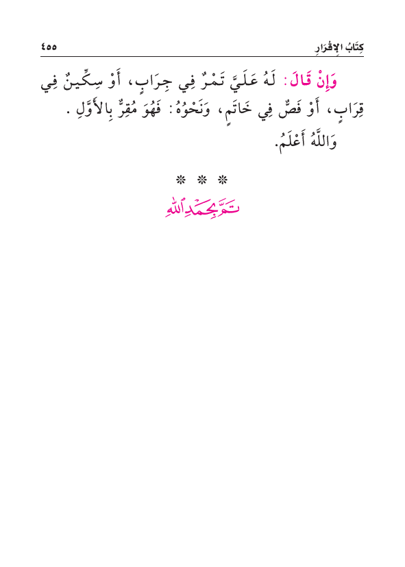 وَإِنْ قَالَ: لَهُ عَلَيَّ تَمْرٌ فِي جِرَابٍ، أَوْ سِكِّينٌ فِي قِرَابٍ، أَوْ فَصٌّ فِي خَاتَمٍ، وَنَحْوُهُ: فَهُوَ مُقِرٌّ بِالأَوَّلِ.