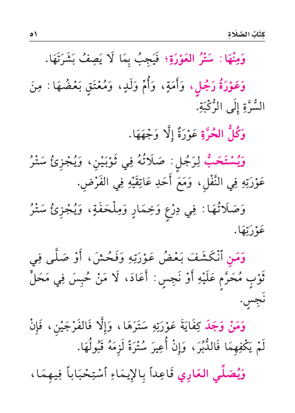 وَمِنْهَا: سَتْرُ العَوْرَةِ؛ فَيَجِبُ بِمَا لَا يَصِفُ بَشَرَتَهَا.
