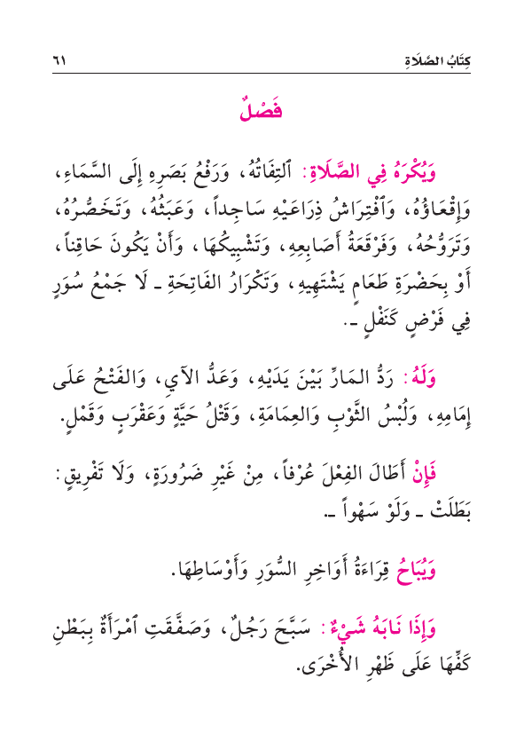 وَيُكْرَهُ فِي الصَّلَاةِ: التِفَاتُهُ، وَرَفْعُ بَصَرِهِ إِلَى السَّمَاءِ، وَإِقْعَاؤُهُ، وَافْتِرَاشُ ذِرَاعَيْهِ سَاجِداً، وَعَبَثُهُ، وَتَخَصُّرُهُ، وَتَرَوُّحُهُ، وَفَرْقَعَةُ أَصَابِعِهِ، وَتَشْبِيكُهَا، وَأَنْ يَكُونَ حَاقِناً، أَوْ بِحَضْرَةِ طَعَامٍ يَشْتَهِيهِ، وَتَكْرَارُ الفَاتِحَةِ - لَا جَمْعُ سُوَرٍ فِي فَرْضٍ كَنَفْلٍ -.
