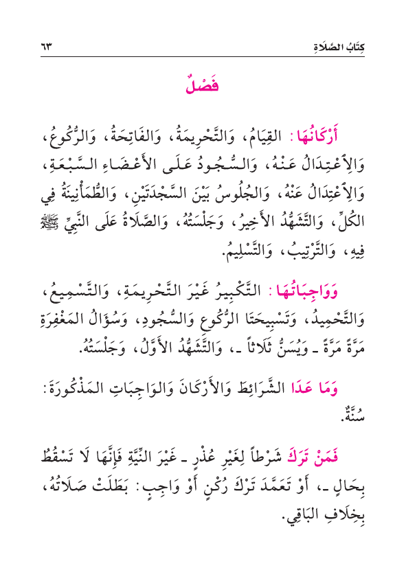 أَرْكَانُهَا: القِيَامُ، وَالتَّحْرِيمَةُ، وَالفَاتِحَةُ، وَالرُّكُوعُ، وَالاعْتِدَالُ عَنْهُ، وَالسُّجُودُ عَلَى الأَعْضَاءِ السَّبْعَةِ، وَالِاعْتِدَالُ عَنْهُ، وَالجُلُوسُ بَيْنَ السَّجْدَتَيْنِ، وَالطُّمَأْنِينَةُ فِي الكُلِّ، وَالتَّشَهُّدُ الأَخِيرُ، وَجَلْسَتُهُ، وَالصَّلَاةُ عَلَى النَّبِيِّ صَلَّى اللهُ عَلَيْهِ وَسَلَّمَ فِيهِ، وَالتَّرْتِيبُ، وَالتَّسْلِيمُ.