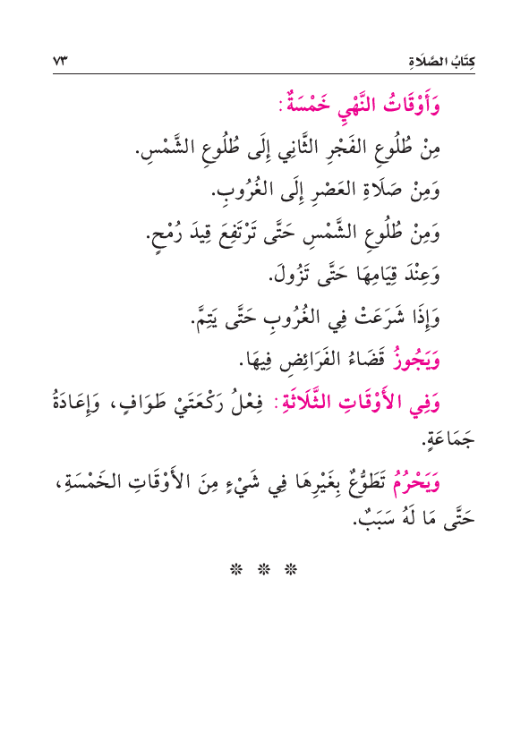 مِنْ طُلُوعِ الفَجْرِ الثَّانِي إِلَى طُلُوعِ الشَّمْسِ، وَمِنْ صَلَاةِ العَصْرِ إِلَى الغُرُوبِ، وَمِنْ طُلُوعِ الشَّمْسِ حَتَّى تَرْتَفِعَ قِيدَ رُمْحٍ، وَعِنْدَ قِيَامِهَا حَتَّى تَزُولَ، وَإِذَا شَرَعَتْ فِي الغُرُوبِ حَتَّى يَتِمَّ.