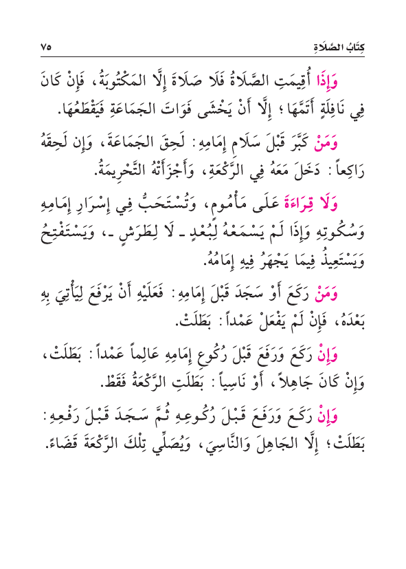 وَإِذَا أُقِيمَتِ الصَّلَاةُ فَلَا صَلَاةَ إِلَّا المَكْتُوبَةَ، فَإِنْ كَانَ فِي نَافِلَةٍ: أَتَمَّهَا؛ إِلَّا أَنْ يَخْشَى فَوَاتَ الجَمَاعَةِ فَيَقْطَعُهَا.