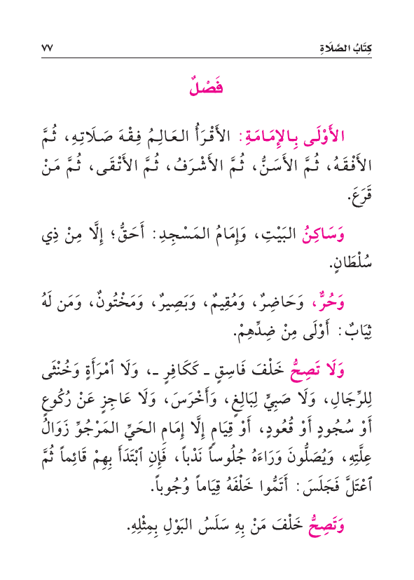 الأَوْلَى بِالإِمَامَةِ: الأَقْرَأُ العَالِمُ فِقْهَ صَلَاتِهِ، ثُمَّ الأَفْقَهُ، ثُمَّ الأَسَنُّ، ثُمَّ الأَشْرَفُ، ثُمَّ الأَتْقَى، ثُمَّ مَنْ قَرَعَ.