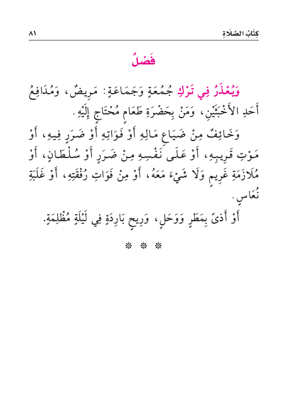 وَيُعْذَرُ فِي تَرْكِ جُمُعَةٍ وَجَمَاعَةٍ: مَرِيضٌ، وَمُدَافِعُ أَحَدِ الأَخْبَثَيْنِ، وَمَنْ بِحَضْرَةِ طَعَامٍ مُحْتَاجٍ إِلَيْهِ، وَخَائِفٌ مِنْ ضَيَاعِ مَالِهِ أَوْ فَوَاتِهِ أَوْ ضَرَرٍ فِيهِ، أَوْ مَوْتِ قَرِيبِهِ، أَوْ عَلَى نَفْسِهِ مِنْ ضَرَرٍ أَوْ سُلْطَانٍ، أَوْ مُلَازَمَةِ غَرِيمٍ وَلَا شَيْءَ مَعَهُ، أَوْ مِنْ فَوَاتِ رُفْقَتِهِ، أَوْ غَلَبَةِ نُعَاسٍ، أَوْ أَذًى بِمَطَرٍ وَوَحَلٍ، وَرِيحٍ بَارِدَةٍ فِي لَيْلَةٍ مُظْلِمَةٍ.