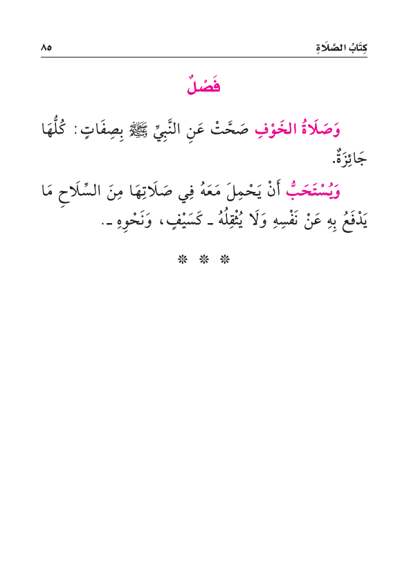 وَصَلَاةُ الخَوْفِ صَحَّتْ عَنِ النَّبِيِّ صَلَّى اللهُ عَلَيْهِ وَسَلَّمَ بِصِفَاتٍ كُلُّهَا جَائِزَةٌ.