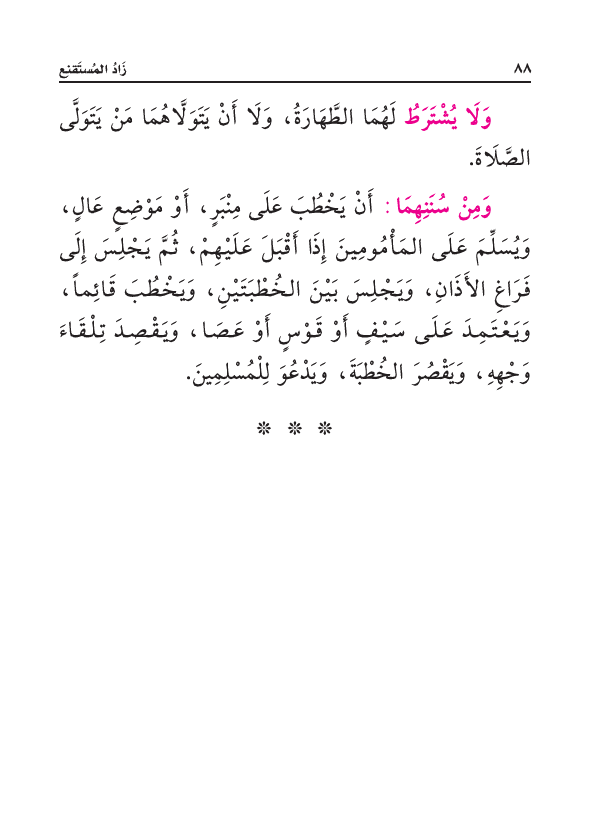 وَمِنْ سُنَنِهِمَا: أَنْ يَخْطُبَ عَلَى مِنْبَرٍ، أَوْ مَوْضِعٍ عَالٍ، وَيُسَلِّمَ عَلَى المَأْمُومِينَ إِذَا أَقْبَلَ عَلَيْهِمْ، ثُمَّ يَجْلِسَ إِلَى فَرَاغِ الأَذَانِ، وَيَجْلِسَ بَيْنَ الخُطْبَتَيْنِ، وَيَخْطُبَ قَائِماً، وَيَعْتَمِدَ عَلَى سَيْفٍ أَوْ قَوْسٍ أَوْ عَصَا، وَيَقْصِدَ تِلْقَاءَ وَجْهِهِ، وَيَقْصُرَ الخُطْبَةَ، وَيَدْعُوَ لِلْمُسْلِمِينَ.