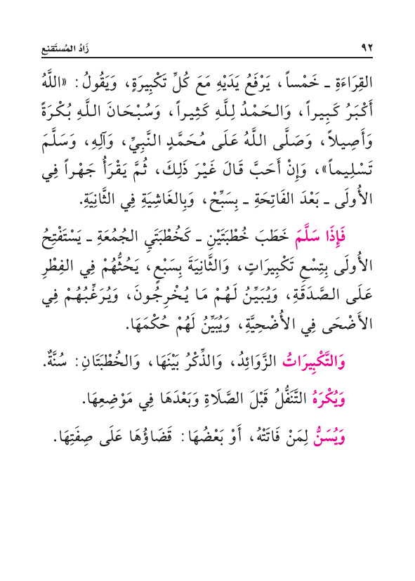القِرَاءَةِ - خَمْساً، يَرْفَعُ يَدَيْهِ مَعَ كُلِّ تَكْبِيرَةٍ، وَيَقُولُ: «اللَّهُ أَكْبَرُ كَبِيراً، وَالحَمْدُ لِلَّهِ كَثِيراً، وَسُبْحَانَ اللَّهِ بُكْرَةً وَأَصِيلاً، وَصَلَّى اللَّهُ عَلَى مُحَمَّدٍ النَّبِيِّ، وَآلِهِ، وَسَلَّمَ تَسْلِيماً»، وَإِنْ أَحَبَّ قَالَ غَيْرَ ذَلِكَ، ثُمَّ يَقْرَأُ جَهْراً فِي الأُولَى - بَعْدَ الفَاتِحَةِ - بِسَبِّحْ، وَبِالغَاشِيَةِ فِي الثَّانِيَةِ.