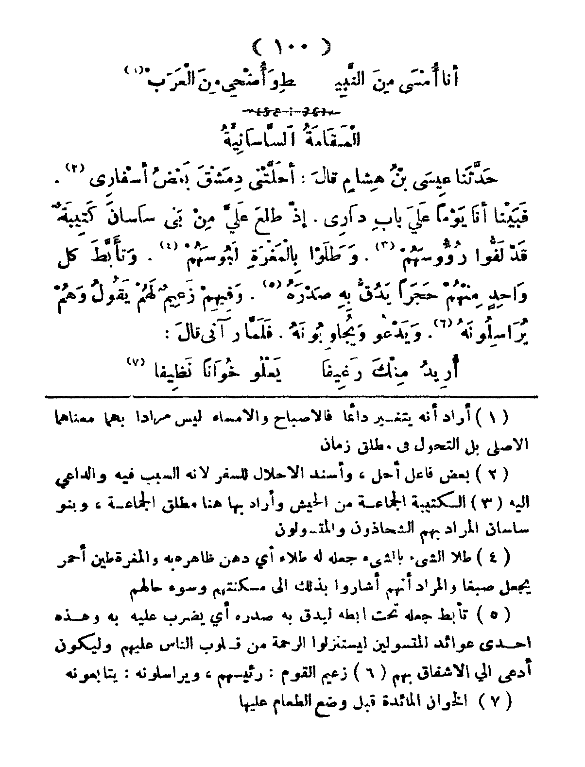 حَدَّثَنَا عِيسى بْنُ هِشَامٍ قَالَ: أَحَلَّتْنِي دِمَشْقَ بَعْضُ أَسْفارِي، فَبَيْنَا أَنَا يَوْماً عَلى بَابِ دارِي، إِذْ طَلعَ عَلَيَّ مِنْ بَنِي سَاسانَ كَتِيبَةٌ قَدْ لَفُّوا رُؤُوَسُهمْ، وَصَلَوْا بالْمَغْرَةِ لَبُوسَهُمْ، وَتَأَبَّطَ كلُّ وَاحِدٍ مِنْهُمْ حَجَراً يَدُقُّ بِهِ صدْرَهُ، وَفِيهِمْ زَعِيمٌ لَهُمْ يَقُولُ وَهُمْ يُرَاسِلونَهُ، وَيْدعُو وَيُجَاوبُونَهُ، فَلَمَّا رآني قَالَ: