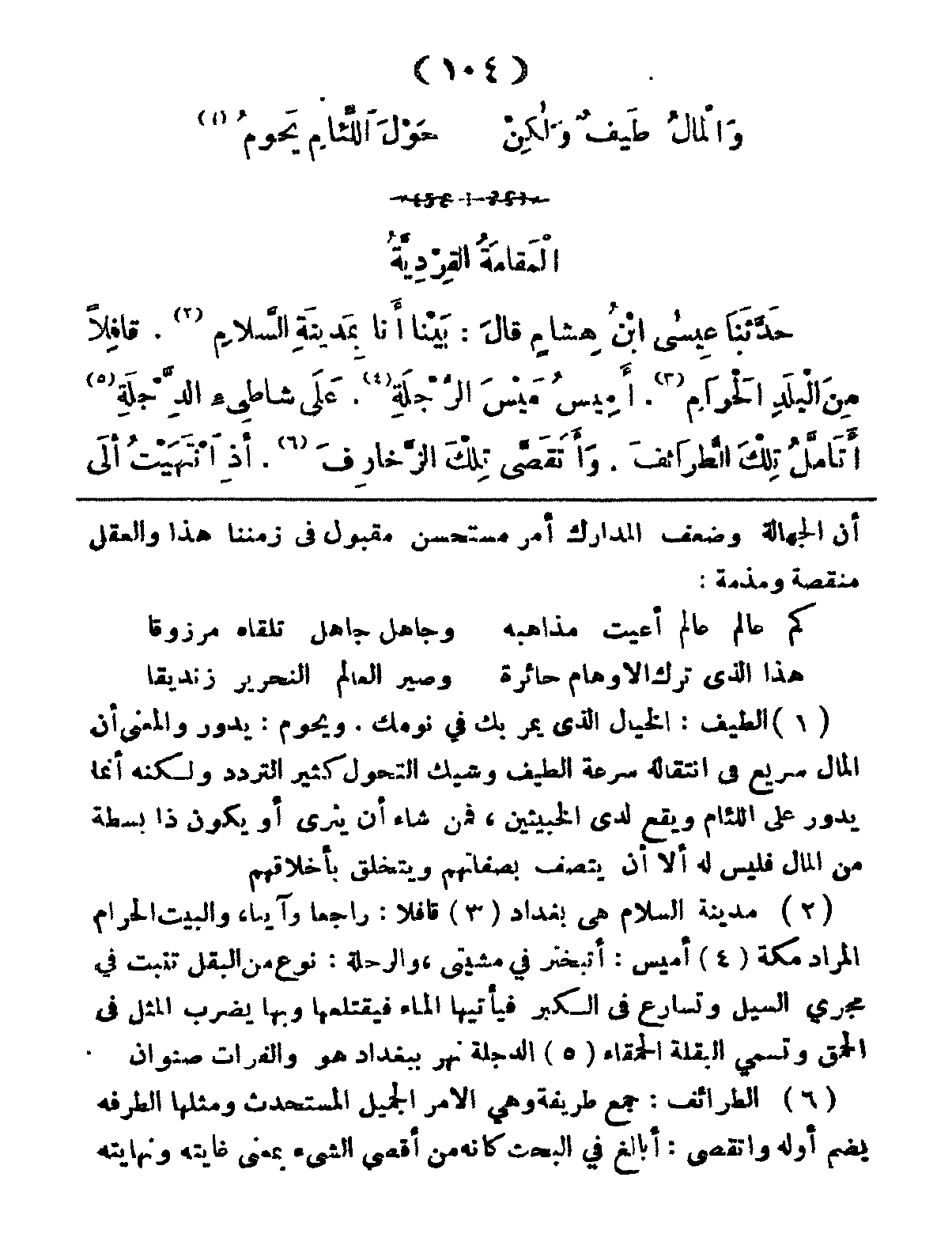 بَيْنَا أَنا بِمَديِنَةِ السَّلامِ، قَافِلاً مِنَ البَلَدِ الحرَامِ، أَمِيسُ مَيْسَ الرِّجْلَةِ، على شاطئِ الدِّجْلَةِ، أَتَأَمَّلُ تِلْكَ الطَّرَائِفَ، وَأَتَقَصَّى تِلْكَ الزَّخَارِفَ، إِذْ انْتَهَيْتُ إِلَى
