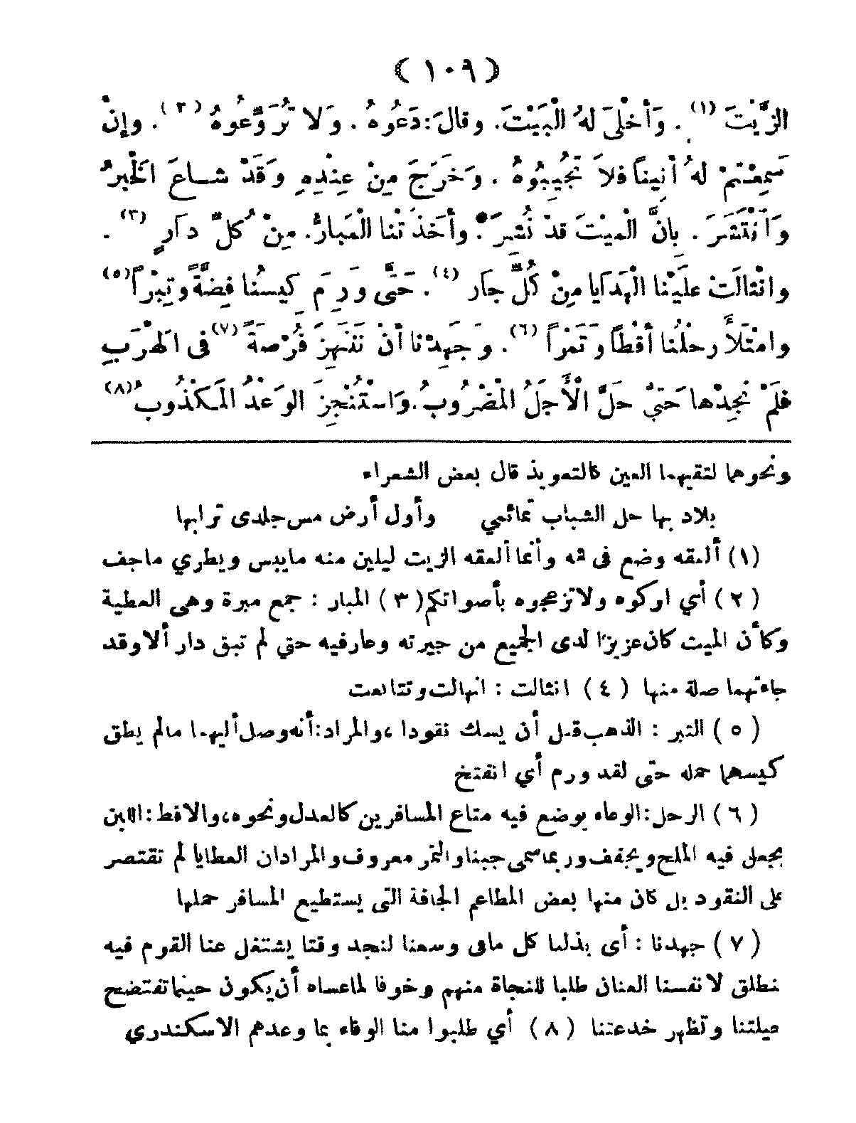 الزَّيْتَ، وَأَخْلَى لَهُ البَيْتَ، وَقَالَ: دَعُوهُ وَلا تُرَوِّعُوهُ، وَإِنْ سَمِعْتُمْ لَهُ أَنِيناً فَلاَ تُجِيبُوهُ، وَخَرَجَ مِنْ عِنْدِهِ وَقَدْ شَاعَ الخَبَرُ وانْتَشَرَ، بِأَنَّ المَيِّتَ قَدْ نُشِرَ، وَأَخَذَتْنَا المَبارُّ، مِنْ كُلِّ دَارٍ، وَانْثَالَتْ عَلَيْنا الهَدَايا مِنْ كُلِّ جَار، حَتَّى وَرِمَ كِيسُنَا فِضَّةً وَتِبْراً وامْتَلأَ رَحْلُنَا أَقِطاً وَتَمْراً، وَجَهَدْنا أَنْ نَنْتَهِزَ فُرْصَة في الهَرَبِ فَلَمْ نَجِدْهَا، حَتَّى حَلَّ الأَجَلُ المَضْرُوبُ، واسْتُنْجِزَ الوَعْدُ المَكْذُوبُ