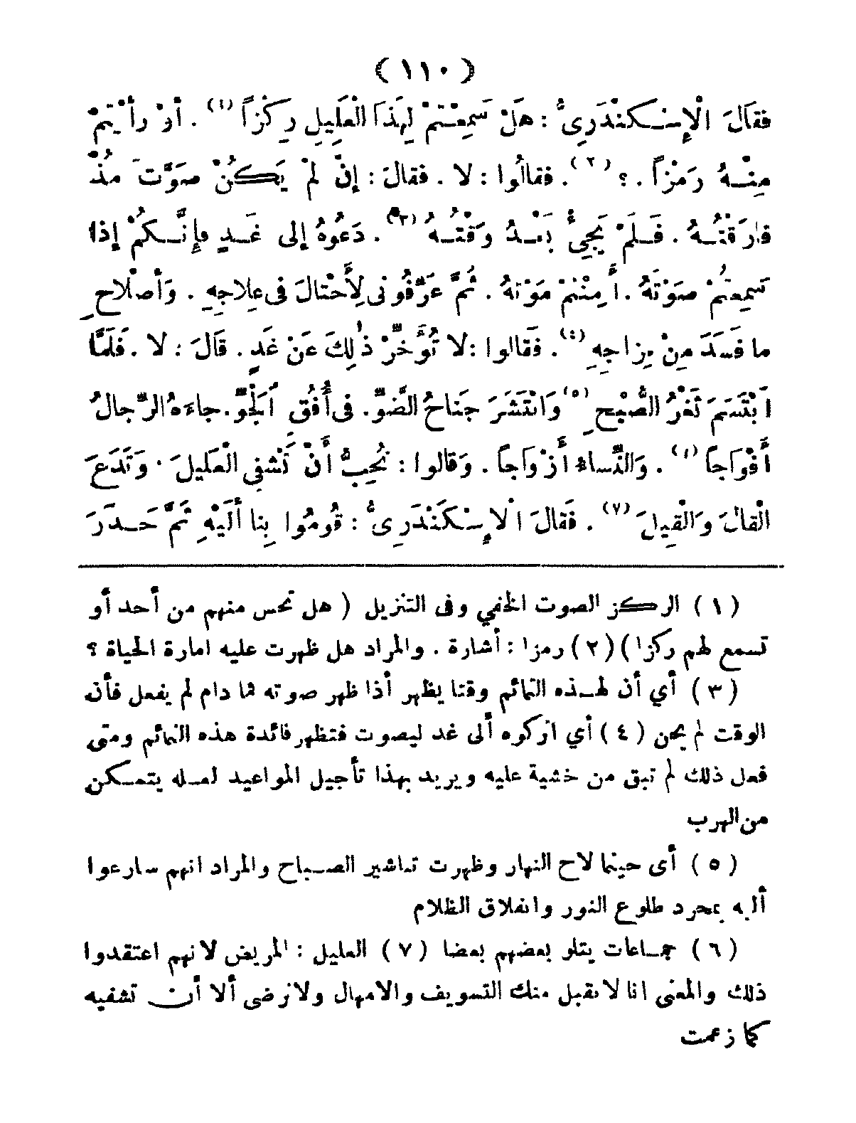 فَقَالَ الإِسْكَنْدَرِيُّ: هَلْ سَمِعْتُمْ لِهَذَا العُلَيِلِ رِكْزاً، أَوْ رَأَيْتُمْ مِنْهُ رَمْزاً؟ فَقَالوا: لا، فَقالَ: إِنْ لَمْ يَكُنْ صَوَّتَ مُذْ فَارَقْتُهُ، فَلَمْ يَجِيئْ بَعْدُ وَقْتُهُ، دَعُوهُ إِلَى غَدٍ فَإِنَّكُمْ إِذا سَمِعْتُمْ صَوْتَهُ، أَمِنْتُمْ مَوْتَهُ، ثُمَّ عَرِّفُونِي لأَحْتَالَ في عِلاجِهِ، وإِصْلاحِ ما فَسَدَ مِنْ مِرَاجِهِ، فَقَالوا: لا تُؤَخِّرْ ذَلِكَ عَنْ غَدٍ، قَالَ: لا، فَلَمَّا ابْتَسَمَ ثَغْرُ الصُّبْحِ وانْتَشَر جَناحُ الضَّوِّ، في أُفُقِ الجَوِّ، جاءَهُ الرِّجَالُ أَفْوَاجاً، والنِّساءُ أَزْوَاجاً، وَقَالوا: نُحِبُّ أَنْ تَشْفِيَ العَلِيلَ، وَتَدَعَ القَالَ والقِيلَ، فَقَالَ الإِسْكَنْدَرِيُّ: قُومُوا بِنا إِلَيْهِ، ثُمَّ حَدَرَ