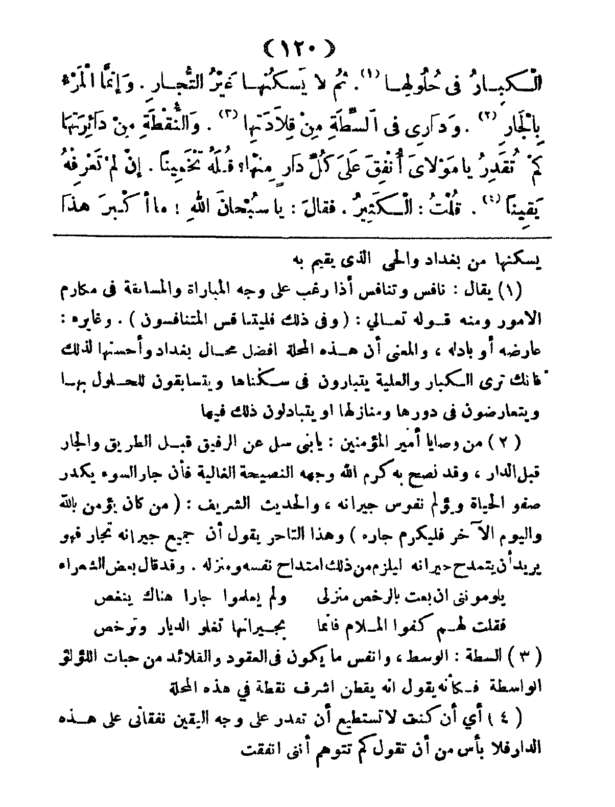 الكِبَارُ فِي حُلُولِهَا، ثُمَّ لاَ يَسْكُنُهَا غَيْرُ التُّجَّارِ، وَإِنَّمَا المَرْءُ بِالْجَارِ وَدَارِى فِي السِّطَةِ مِنْ قِلادَتِهَا، وَالنُّقْطَةِ من دَائِرتَهَا، كَمْ تُقَدِّرُ يَا مَوْلايَ أُنْفِقَ عَلى كُلِّ دَارٍ مِنْهَا؟ قُلْهُ تَخْمِيناً إِنْ لَمْ تَعْرِفُهُ يَقِيناً، قُلْتُ: الكَثِيرُ، فَقَالَ: يَا سُبْحَانَ اللهِ! مَا أَكْبَرَ هَذا