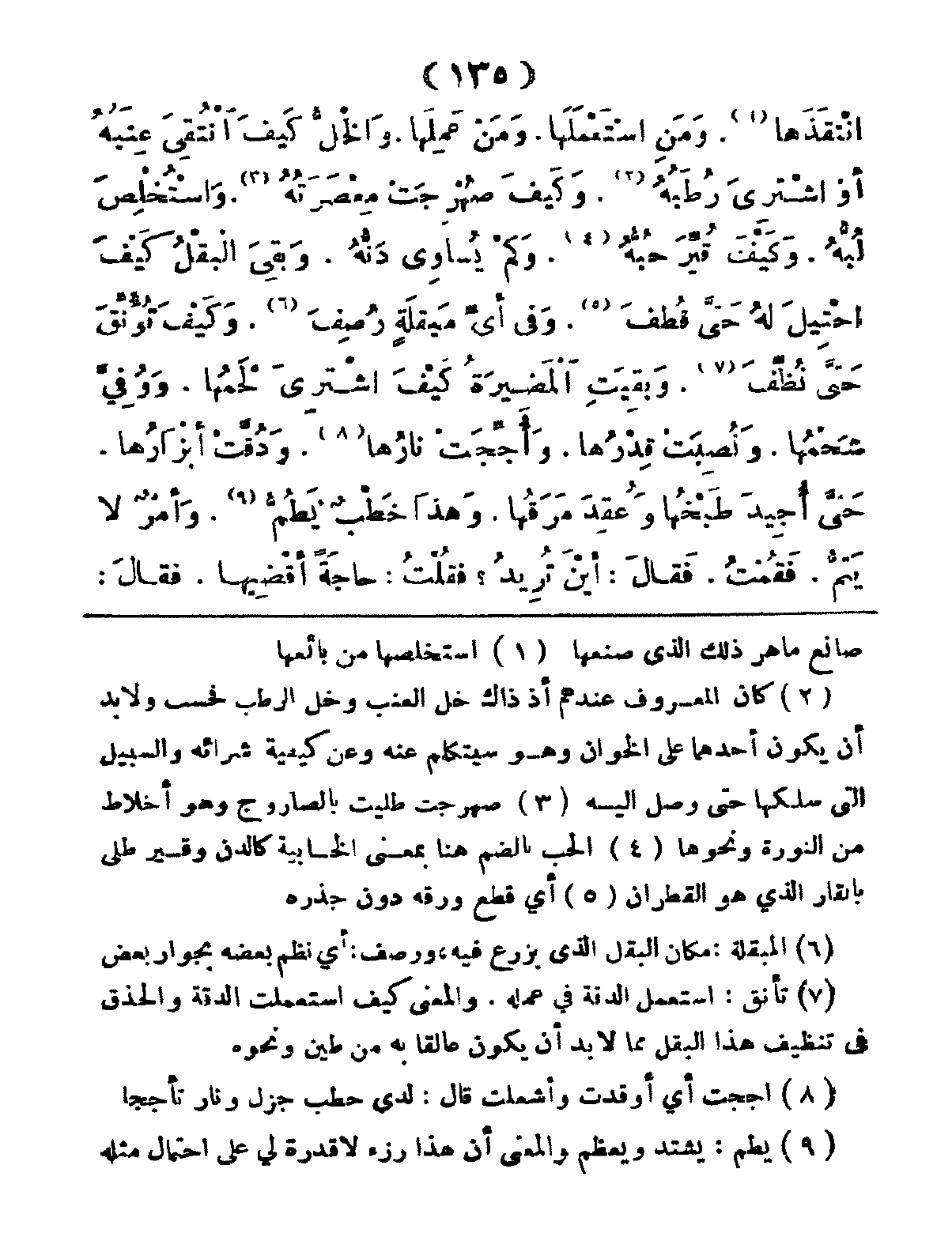 انْتَقَذَهَا، وَمَنِ اسْتَعْمَلَهاَ،؟ وَمَنْ عَمِلَها؟ والخَلُّ كَيفَ انْتُقِى عِنَبُهُ، أَوْ اشْتُرِيَ رُطَبُهُ، وَكَيفَ صُهْرِجَتْ مِعْصَرَتُهُ؟ وَاسْتُخْلِصَ لُبُّهُ؟ وَكَيْفَ قُيِّرَ حَبُّهُ؟ وَكَمْ يُساوِي دَنُّهُ؟ وَبَقِيَ البَقْلُ كيفَ احْتِيلَ لَهُ حَتَّى قُطِفَ؟ وَفِي أَيِّ مَبْقَلَةٍ رُصِفَ؟ وَكَيْفَ تُؤُنِّقَ حَتَّى نُظِّفَ؟ وَبَقيتِ المَضِيرَةُ كَيْفَ اشْتُرِيَ لَحْمُها؟ وَوُفِّيَ شَحْمُهَا؟ ونُصِبَتْ قِدْرُها، وَأَجِّجَتْ نَارُها، وَدُقَّتْ أَزَارُها، حَتَّى أُجِيدَ طَبْخُها وَعُقِدَ مَرَقُها؟ وَهذَا خَطْبٌ يَطُمُّ، وأَمْرٌ لا يَتِمُّ، فَقُمْتُ، فَقَالَ: أَيْنَ تُرِيدُ؟ فَقُلْتُ: حَاجَةً أَقْضِيها، فَقَالَ:
