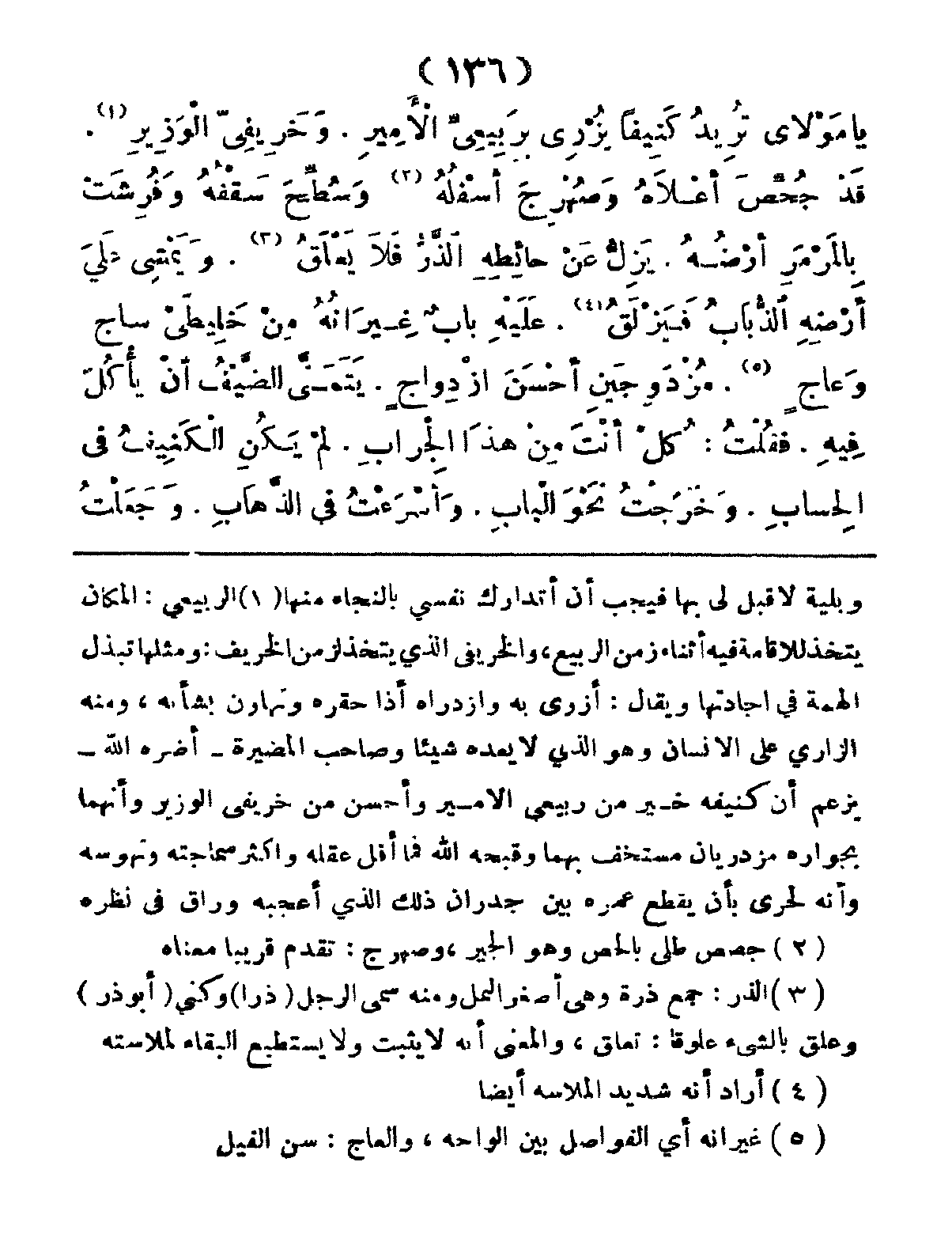 يَامَوْلايَ تُرِيدُ كَنِيفاً يُزْري برَبِيِعيَّ الأَمِيرِ، وَخَريِفِيَّ الوَزِيرِ، قَدْ جُصِّصَ أَعْلاَهُ، وَصُهْرِجَ أَسْفَلُهُ، وَسُطِّحَ سَقْفُهُ، وَفُرِشَتْ بِالمَرْمَرِ أَرْضُهُ، يَزِلُّ عَنْ حائِطِهِ الذَّرُّ فَلاَ يَعْلَقُ، وَيَمْشِي عَلَى أَرْضُهُ الذُّبَابُ فَيَنْزَلِقُِ، عَلَيْهِ بَابٌ غِيِرَانُهُ مِنْ خَلِيطيْ ساجٍ وَعَاجٍ، مُزْدَوجَينِ أَحْسَنَ ازْدِواجٍ، يِتِمِنَّى الضَّيْفُ أَنْ يَأَكُلَ فِيهِ، فَقُلْتُ: كُلْ أَنْتَ مِنْ هَذا الجِرابِ، لَمْ يَكُنِ الكَنِيفُ فِي الحِسابِ، وَخَرَجْتُ نَحْوَ البَابِ، وَأَسْرَعْتُ فِي الذَّهَابِ، وََجَعَلْتُ