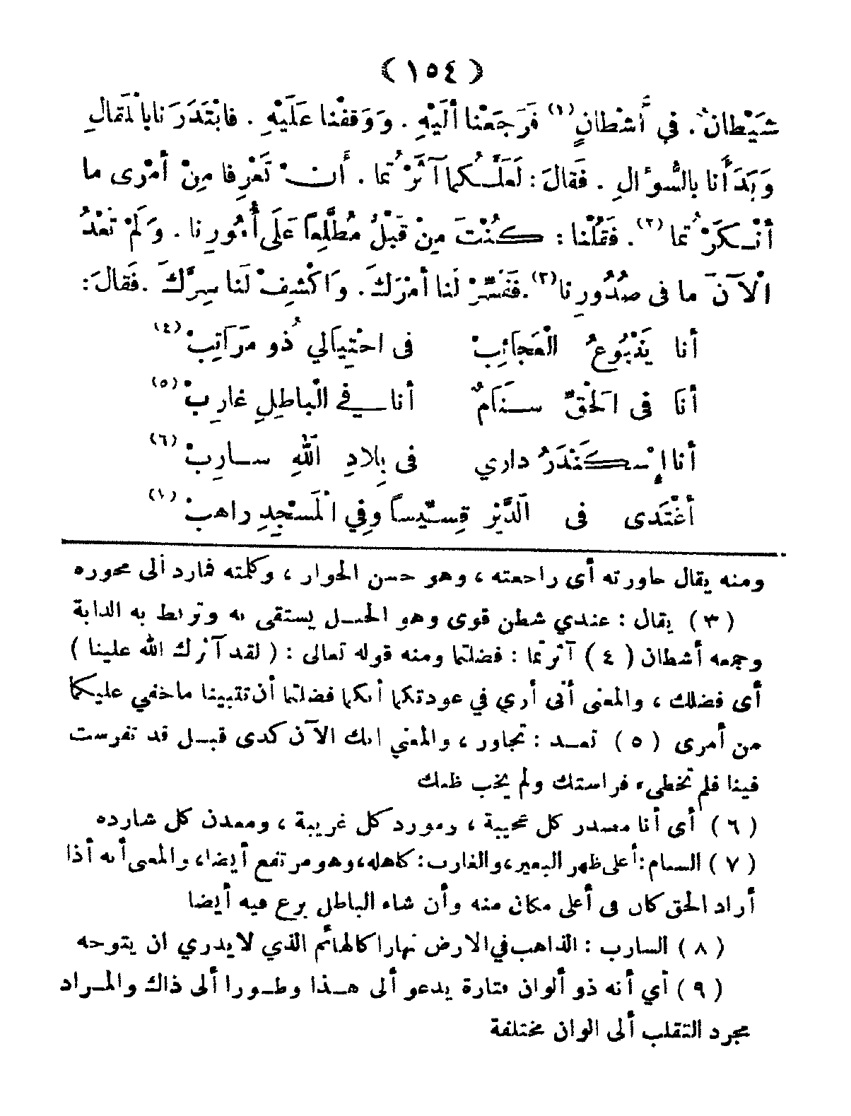 شَيْطَانٌ فِي أَشْطَانٍ، فَرَجِعْنَا إِلَيْهِ، وَوَقَفْنَا عَلَيْهِ، فَابْتَدَرَ بِالْمَقَالِ، وَبَدأَنَا بِالسُّؤَالِ، فَقالَ: لَعَلَّكُمَا آثَرْتُمَا، أَنْ تَعْرِفَا مِنْ أَمْرِي ما أَنْكَرْتُمَا، فَقُلْنَا: كُنْتَ مِنْ قَبْلُ مُطَّلِعَاً على أُمُورِنَا، وَلَمْ تَعْدُ الآنَ مَا في صُدُورِنَا، فَفَسِّرْ لَنَا أَمْرَكَ، وَاكْشِفْ لَنَا سِرَّكَ، فَقالَ: