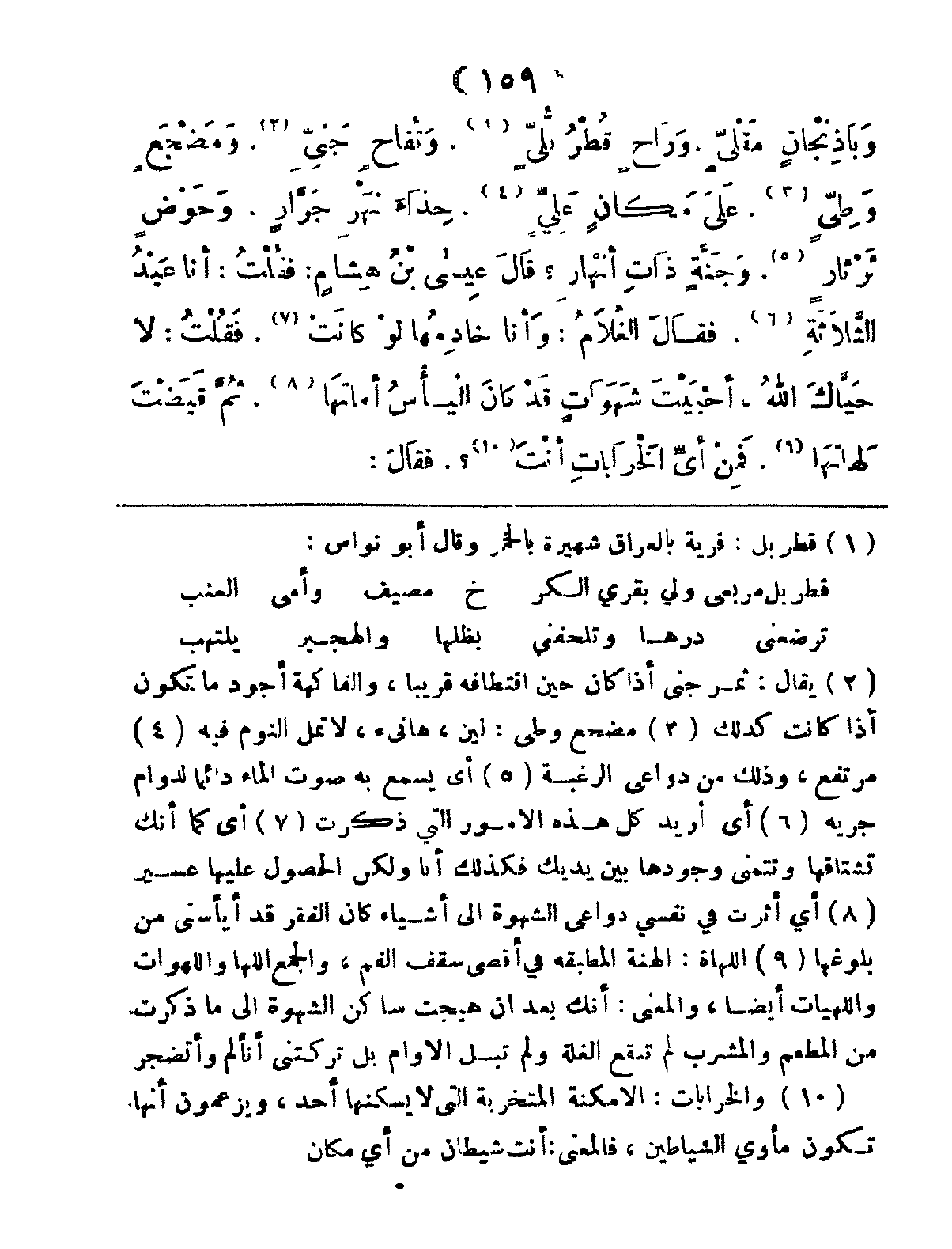 وَبَاذِنْجَانٍ مَقْليٍّ، وَرَاحٍ قُطْرُبُّليٍّ، وَتُفَّاحٍ جَنِيٍ، وَمَضْجَعٍ وَطِيٍّ، عَلَى مَكَانٍ عَليٍّ، حِذَاءَ نَهْرٍ جَرَّارٍ، وَحَوْضٍ ثَرْثَارٍ، وَجَنَّةٍ ذَاتِ أَنْهَارٍ؟ قَالَ عِيسَى بْنُ هِشَامٍ: فَقُلْتُ: أَنَا عَبْدُ الثَّلاَثَةِ، فَقَالَ الغُلاَمُ: وَأَنَا خَادِمُهَا لَوْ كَانَتْ، فَقُلْتُ: لا حَيَّاكَ اللهُ، أَحْيَيْتَ شَهَوَاتٍ قَدْ كَانَ اليَأَسُ أَمَاتَها، ثُمَّ قَبَضْتَ لَهَاتَهَا، فَمنْ أَيِّ الخَرَابَاتِ أَنْتَ؟ فَقالَ: