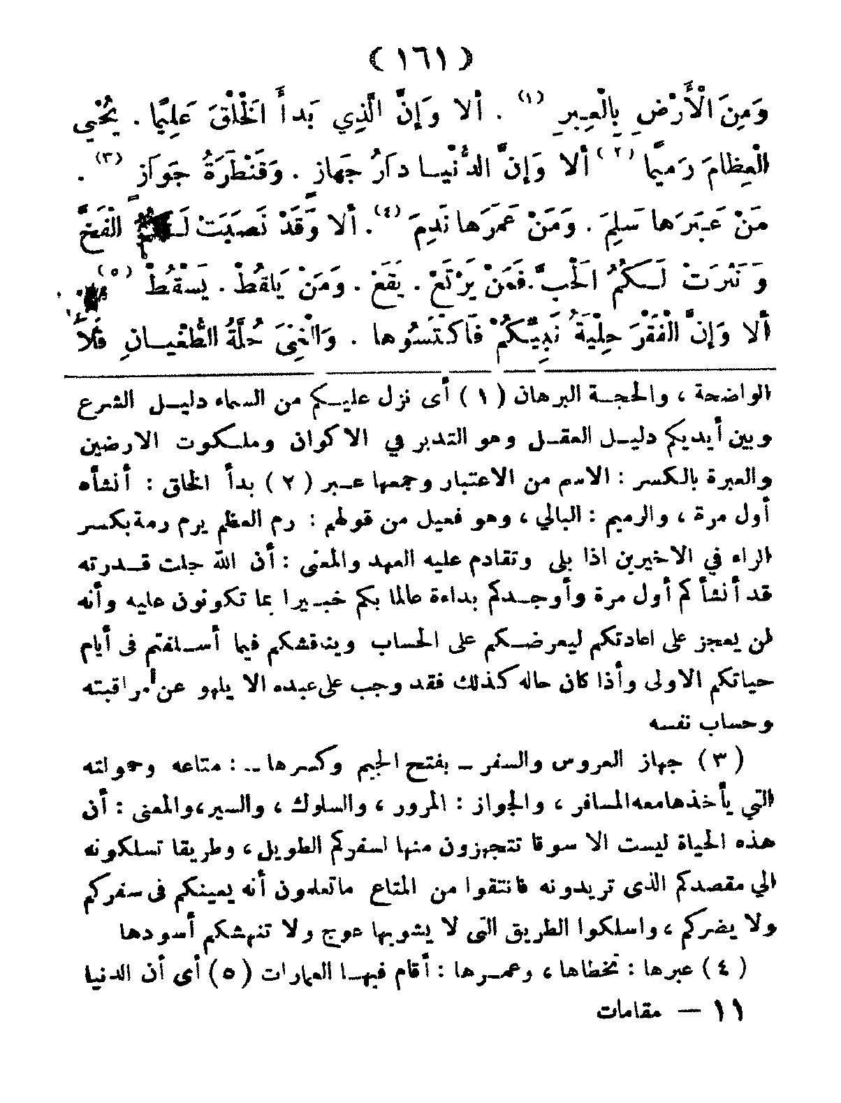 وَمِنَ الأَرْضِ بَالعِبَرِ، أَلا وَإِنَّ الَّذِي بَدَأَ الخَلْقَ عَلِيماً، يُحْيِ العَظامَ رَمِيماً، أَلا وَإِنَّ الدُّنْيا دَارُ جَهَازٍ، وَقَنْطَرَةُ جَوَازٍ، مَنْ عَبَرَها سَلِمَ، وَمَنْ عَمَرها نَدِمَ، أَلا وَقَدْ نَصَبَتْ لَكُمُ الفَخَّ وَنَثرَتْ لَكُمُ الْحَبَّ؛ فَمَنْ يَرْتَعْ، يَقَعْ، وَمَنْ يَلْقُطْ، يَسْقُطْ، أَلا وَإِنَّ الفَقْرَ حِلْيَةُ نَبِيِّكُمْ فَاكْتَسُوهَا، وَالغِنى حُلَّةُ الطُّغْيَانِ فَلاَ
