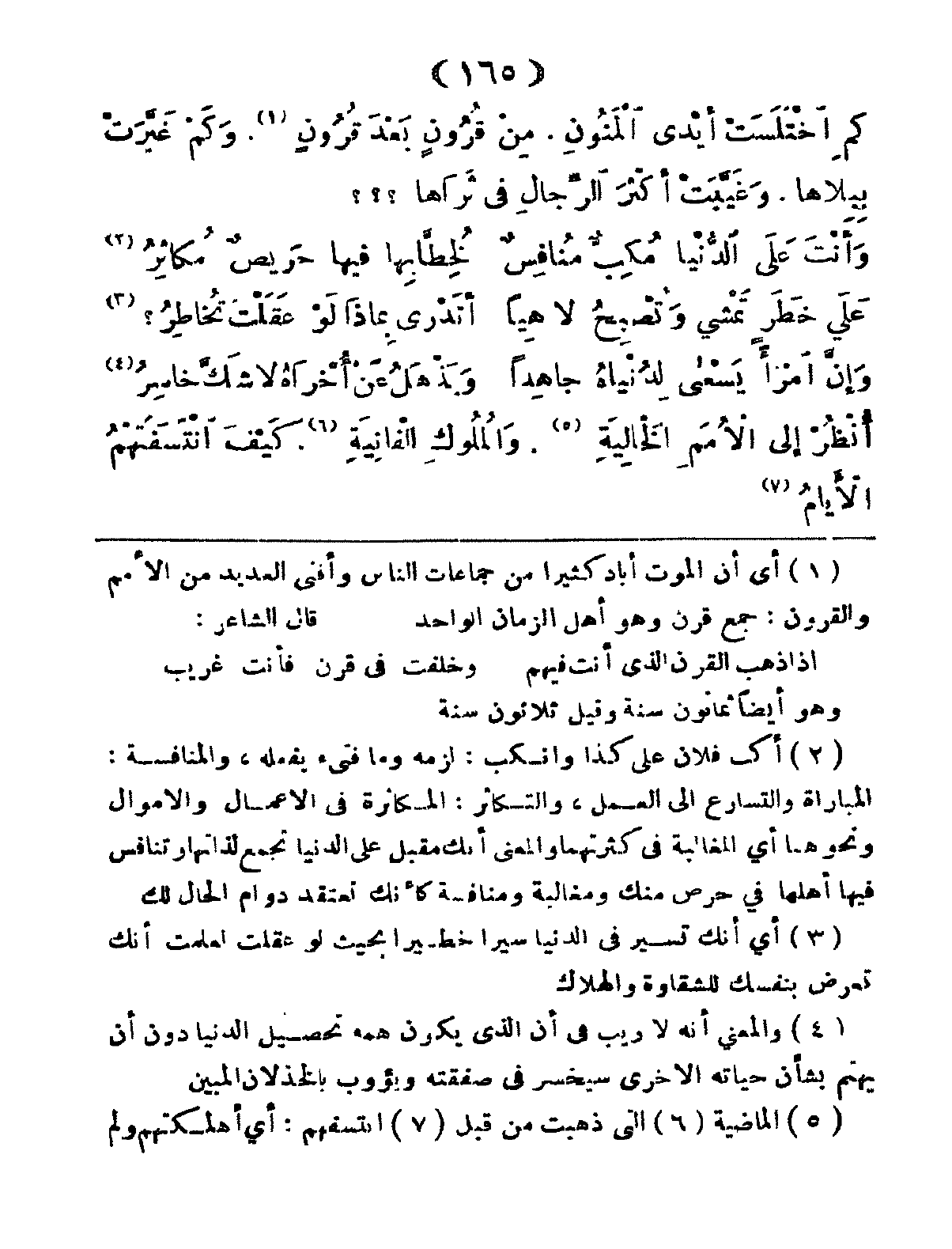 كَمْ اخْتَلَسَتْ أَيْدي المَنُونِ، مِنْ قُرُونٍ بَعْدَ قُرُونٍ؟ َوكَمْ غَيَّرَتْ بِبِلاهَا، وَغَيَّبَتْ أَكْثَرَ الرِّجَالِ في ثَرَاها؟؟؟