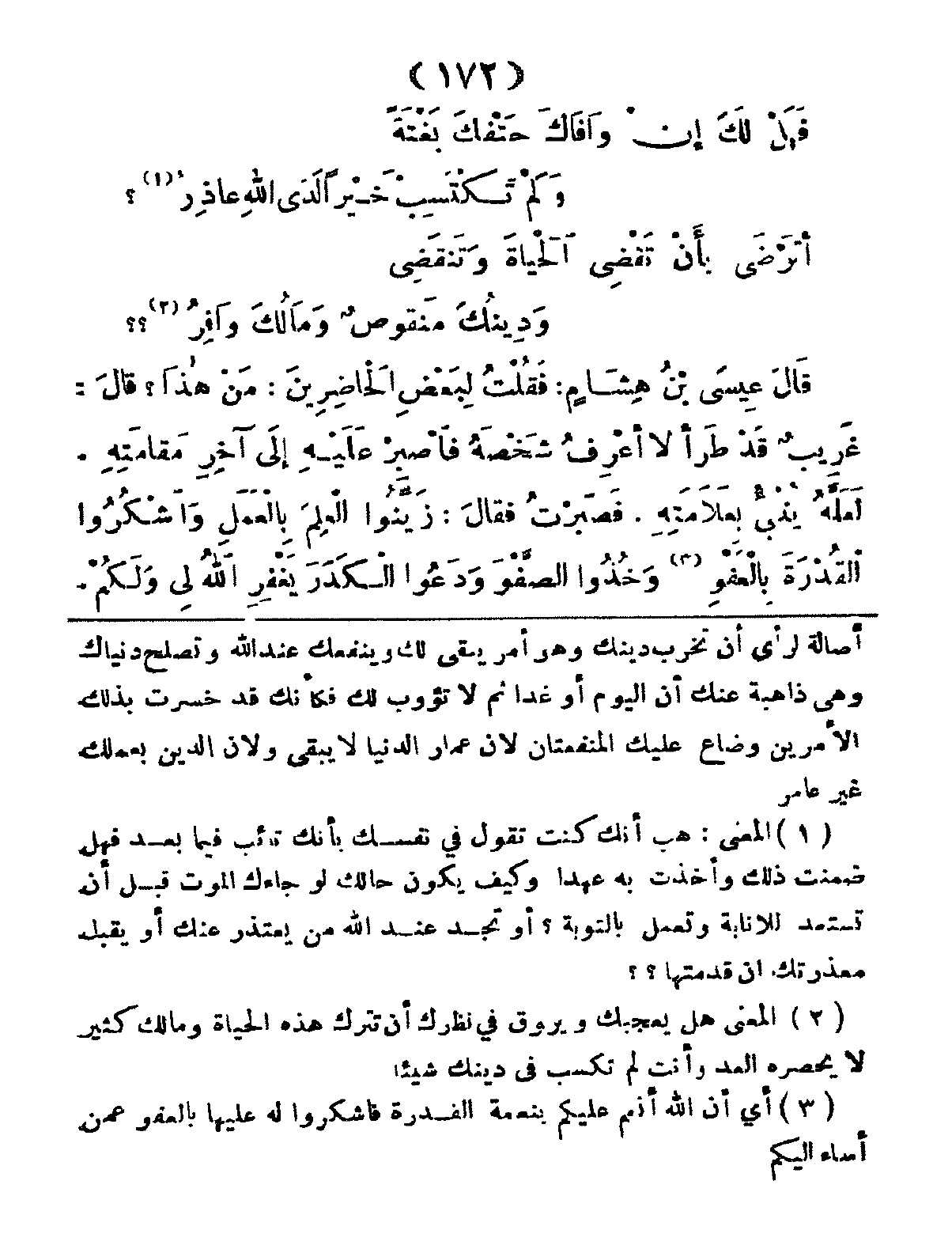 قَالَ عِيسَى بْنُ هِشَامٍ: فَقُلْتُ لِبَعْضِ الحَاضِرِينَ: مَنْ هَذا؟ قَالَ: غَرِيبٌ قَدْ طَرَأَ لاَ أَعْرِفُ شَخْصَهُ، فَاصْبِرْ عَلَيْهِ إِلَى آخِرِ مَقَامَتِهِ، لَعَلَّهُ يُنْبِئُ بِعَلاَمَتِهِ، فَصَبَرْتُ فَقَالَ: زَيِّنُوا العِلْمَ بِالعَمَلِ، وَاشْكُرُوا القُدْرَةَ بِالْعَفْوِ، وَخُذُوا الصَّفْوَ وَدَعوا الكَدَرَ، يَغْفِرِ اللهُ لِي وَلَكُمْ،