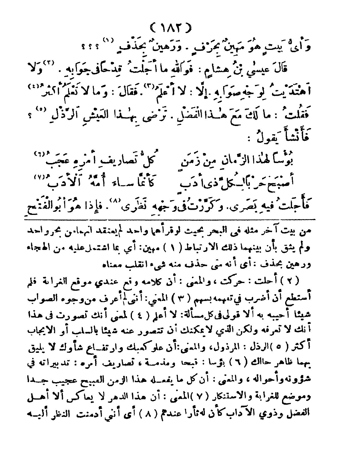 وَأَيُّ بَيْتٍ هُوَ مَهِينٌ بِحَرْفٍ، وَرَهِينٌ بِحَذْفٍ؟؟؟ قَالَ عِيسَى بْنُ هِشَامٍ: فَوَ اللهِ مَا أَجَلْتُ قِدْحَاً في جَوَابهِ، وَلا اهْتَدَيْتُ لِوَجْهِ صَوَابِهِ، إِلاَّ لا أَعْلَمُ. فَقَالَ: وَمَا لاَ تَعْلَمُ أَكْثَرُ، فَقُلْتُ: وَمَا لَكَ مَعْ هَذا الفَضْلِ، تَرْضَى بِهَذا العَيْشِ الرَّذْلِ؟ فَأَنْشَأَ يَقُولُ: